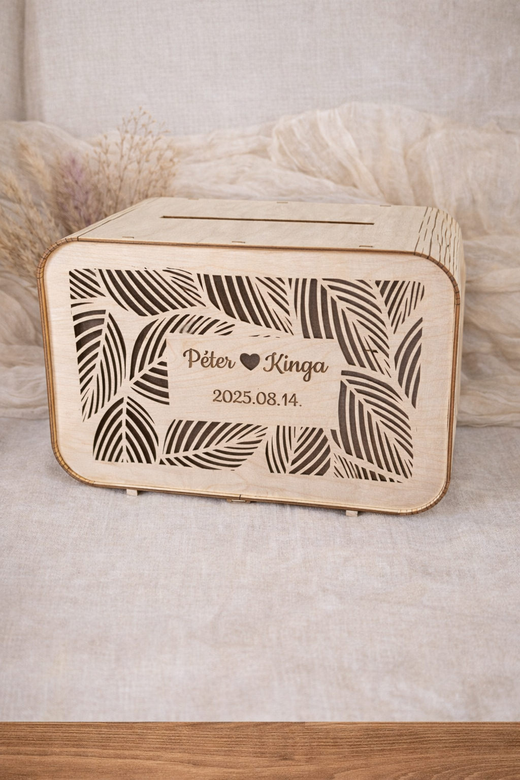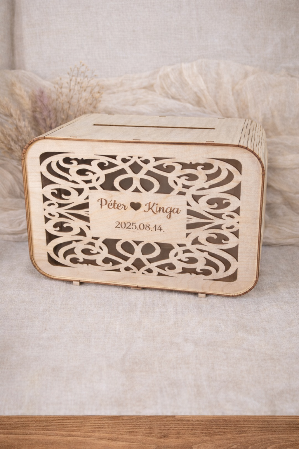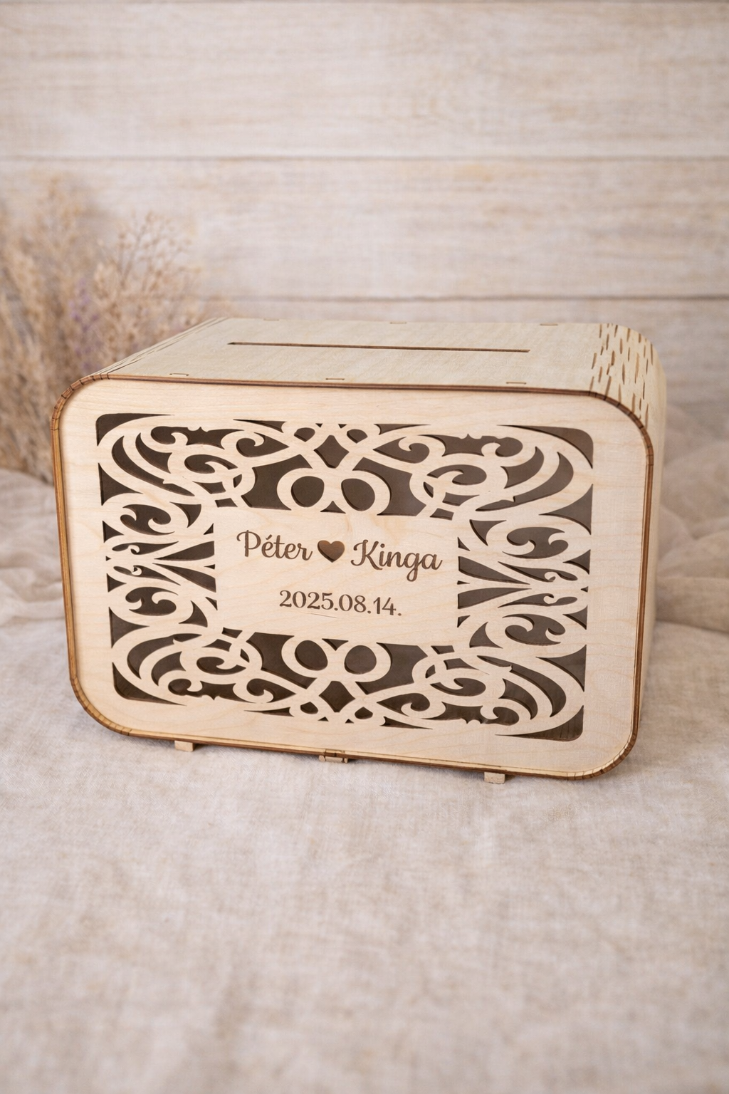 Elhoztuk nektek legújabb pénzgyűjtő nászdobozunkat kivágott előlappal és gravírozott nevekkel, dátummal.